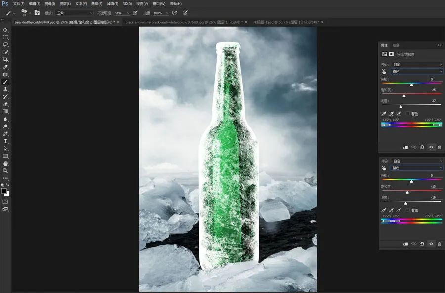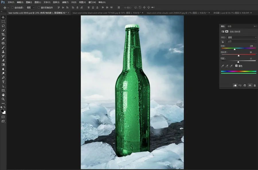5、整个场景是冷色调,感觉这个啤酒的颜色不太协调,用色相饱和度换成绿色。