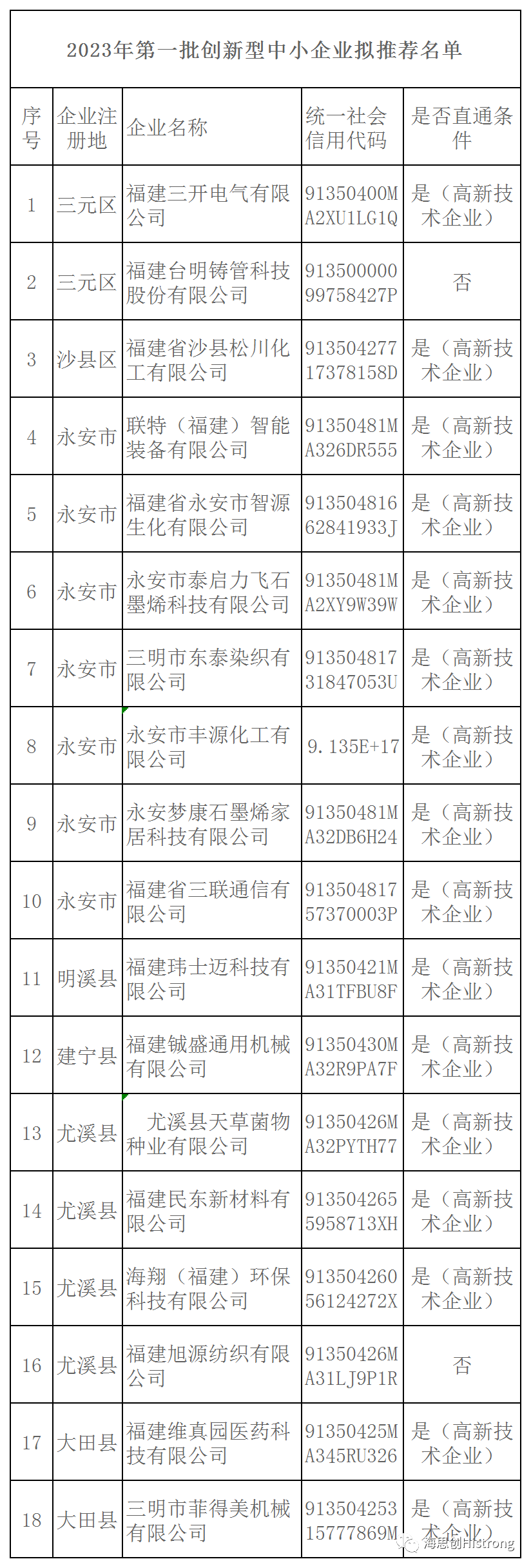 根据省工信厅《关于常态化组织开展创新型中小企业评价和专精特新中小企业认定工作的通知》(闽工信函中小〔2023〕190号)和《福建省优质中小企业梯度培育管理实施细则》(闽工信规〔2022〕12号)文件要求,经各县(市、区)工信局初审推荐,三明市工信局审核,福建三开电气有限公司等18家企业符合《福建省优质中小企业梯度培育管理实施细则》(闽工信规〔2022〕12号)有关创新型中小企业评价标准,拟推荐申报,现予以公示。公示期为5个工作日。 联系电话:市纪委监委驻市工业和信息化局纪检组8223004