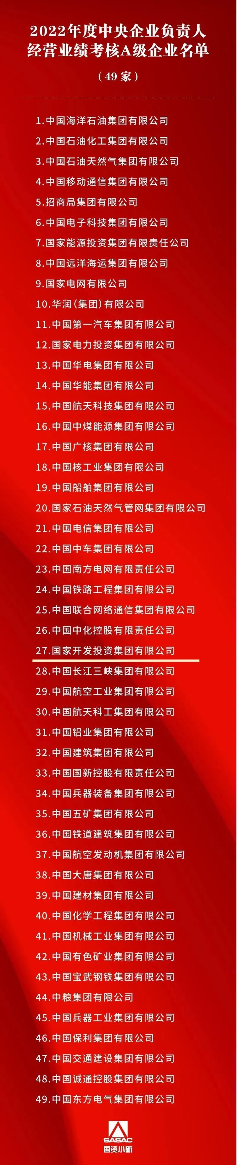 国资小新发布《2022年度中央企业负责人经营业绩考核A级企业名单》显示:根据《中央企业负责人经营业绩考核办法》,2022年度中央企业负责人经营业绩考核结果已经国务院国资委党委会议、委务会议审议通过。A级企业名单如下: