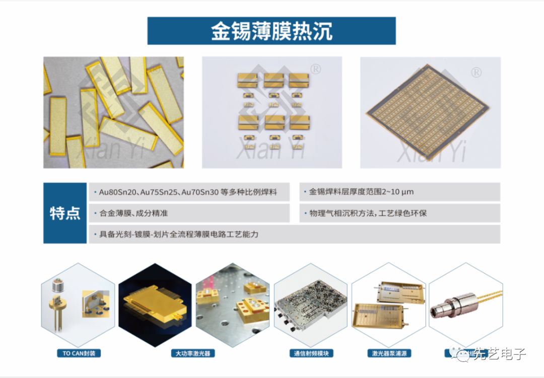 金锡薄膜热沉是表面覆有金锡焊料层的基板,已在光电子行业得到了广泛应用。成分均匀,比例可选(Au:70~80±5wt.%),金锡薄膜热沉的键合区域焊料厚度可得到准确控制(2~10um),并且无须额外使用预成形焊片或焊膏,可直接进行焊接。