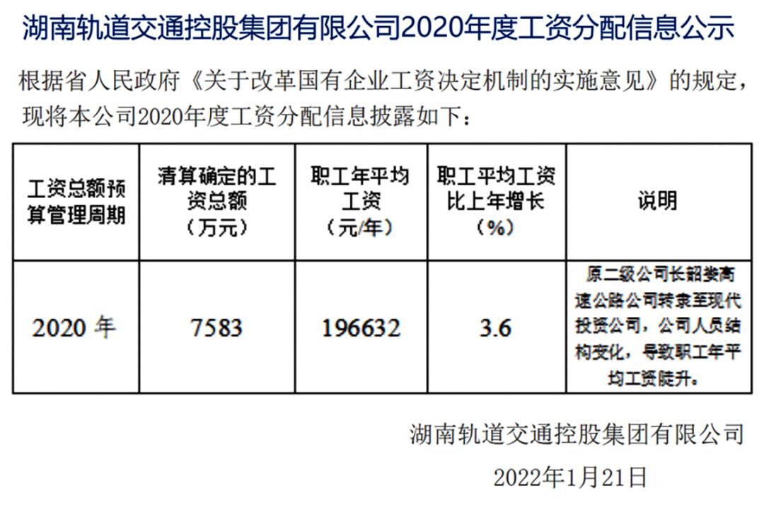 湖南轨道交通控股集团有限公司2020年度工资分配信息公示