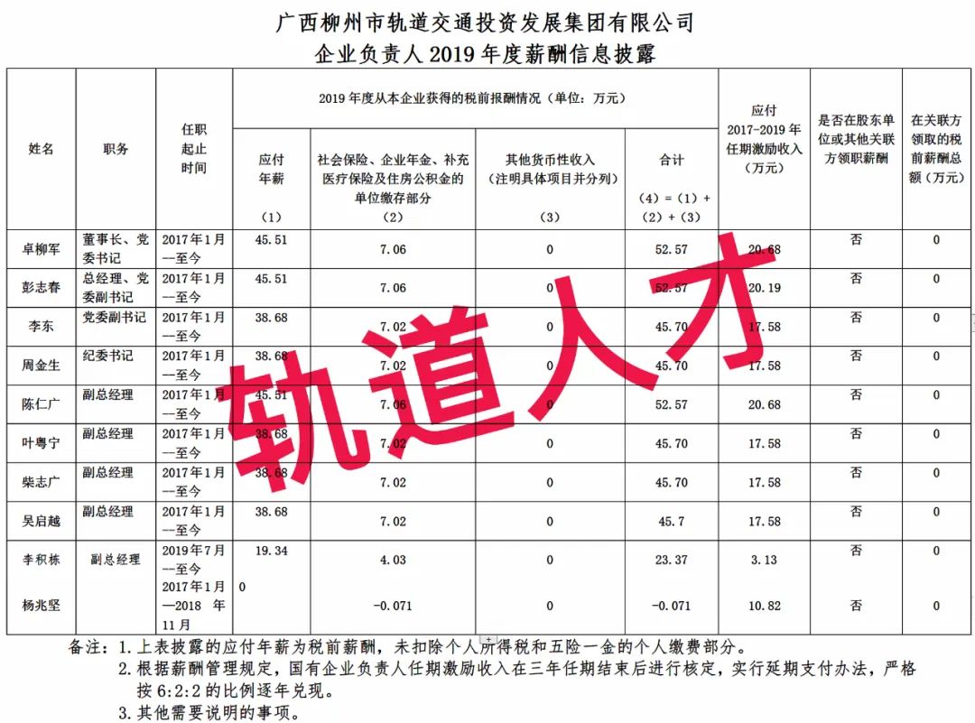 广西柳州市轨道交通投资发展集团有限公司企业负责人2019年度薪酬信息披露