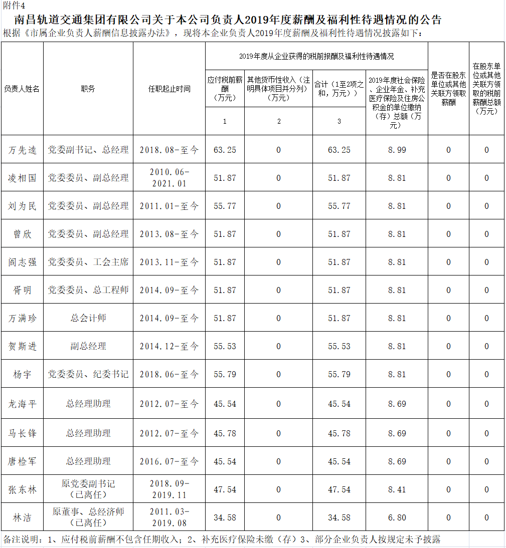 13、南昌轨道交通集团有限公司关于本公司负责人2019年度薪酬及福利性待遇情况的公告