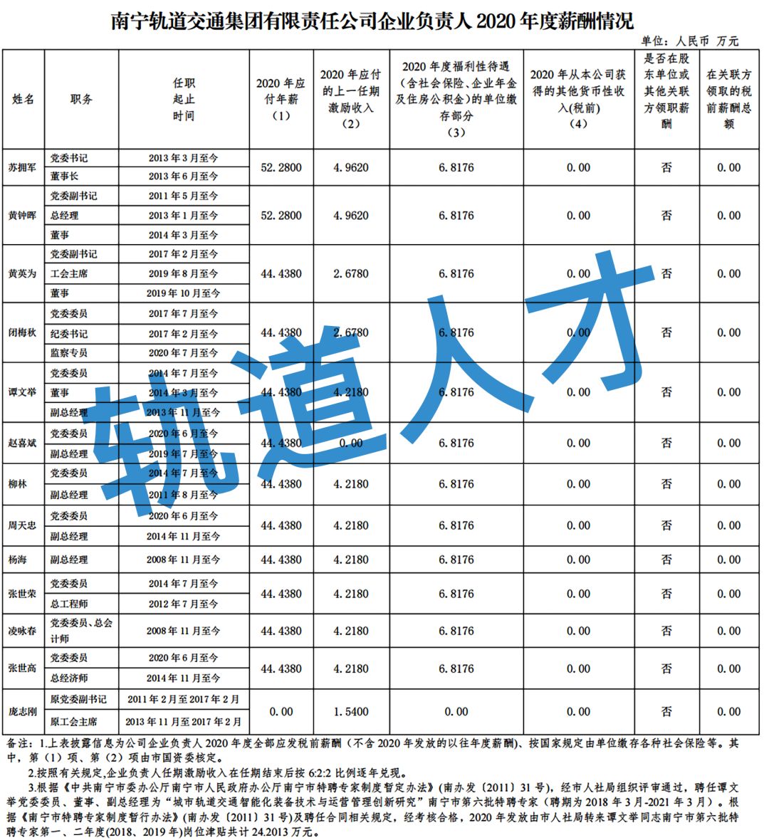 2020年度南宁轨道交通集团有限责任公司企业负责人薪酬信息披露