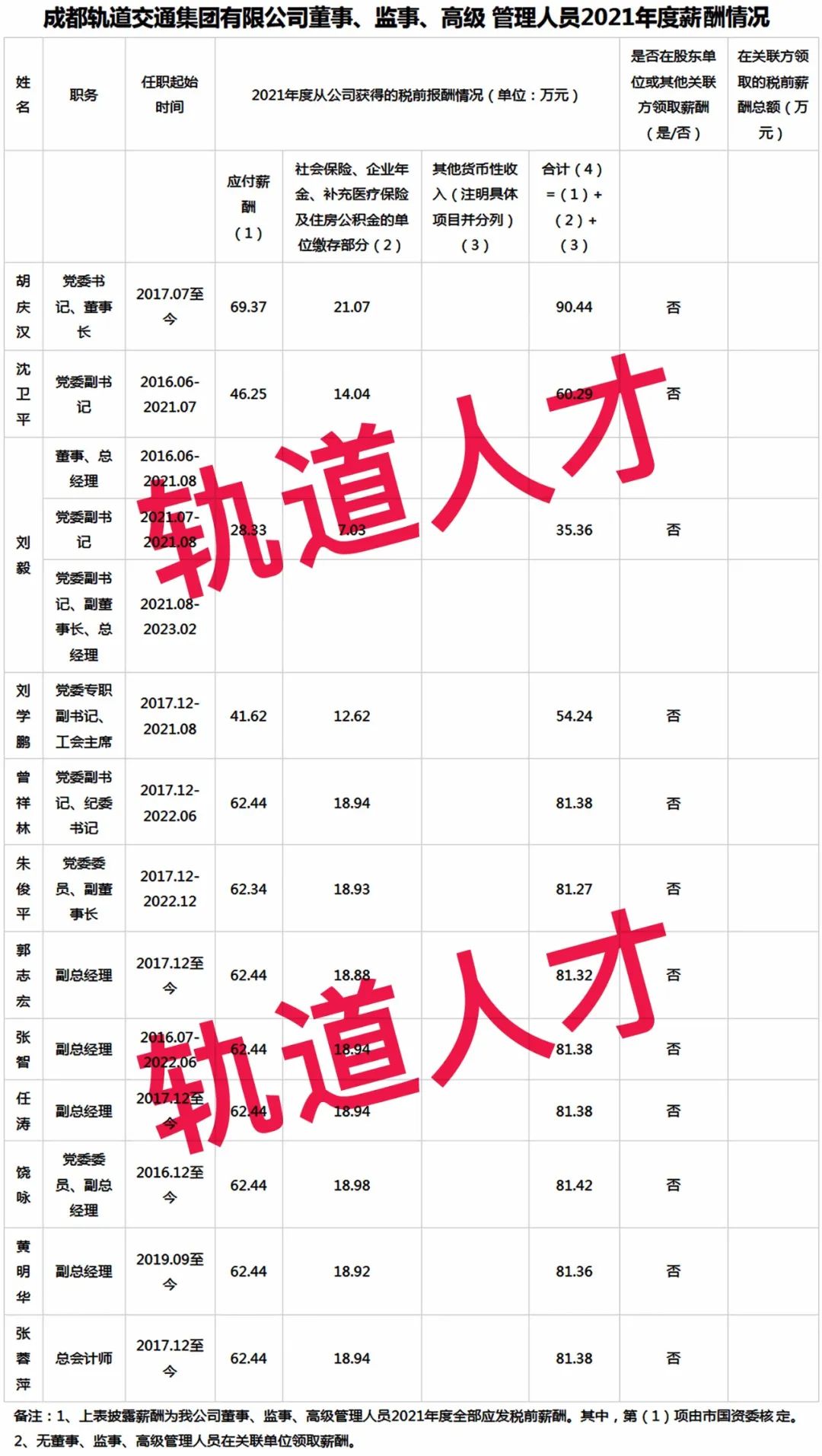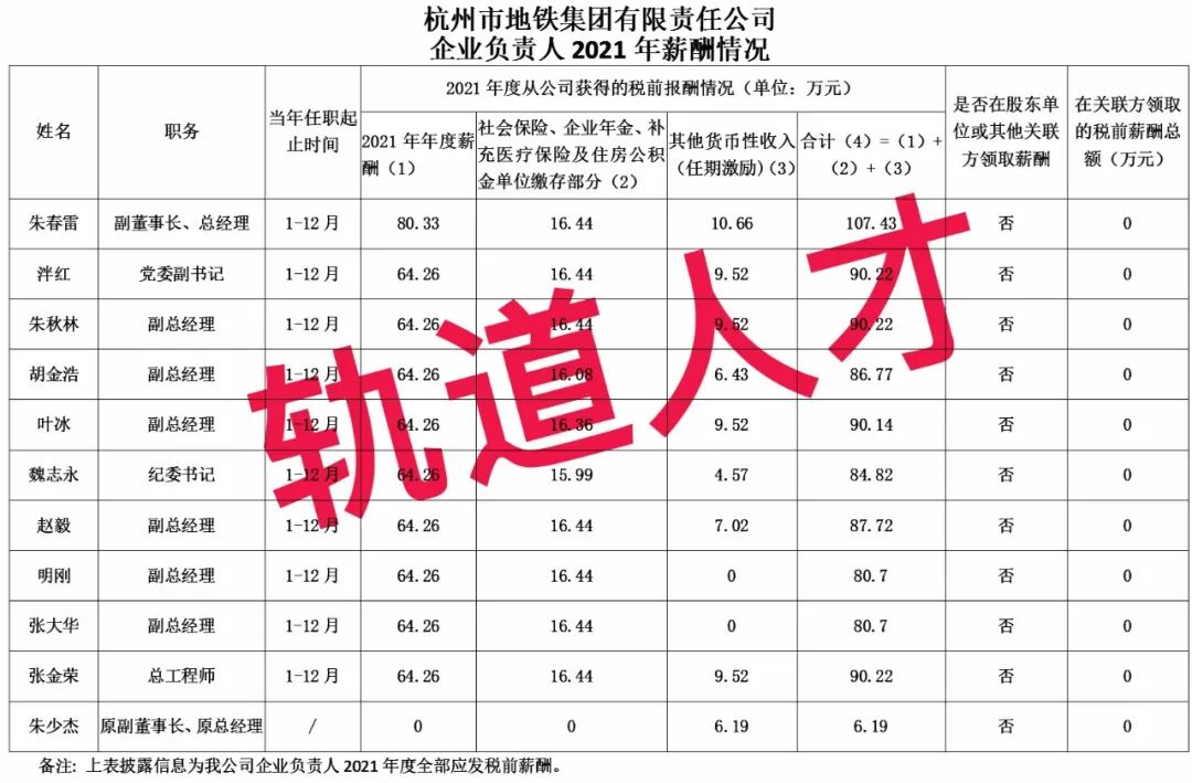 1、杭州市地铁集团有限责任公司企业负责人2021年薪酬情况