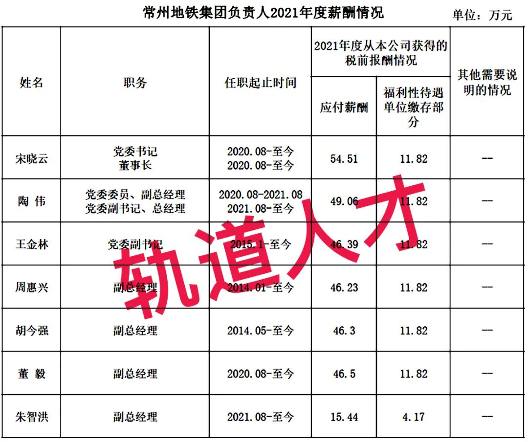 9、常州地铁集团负责人2021年度薪酬情况
