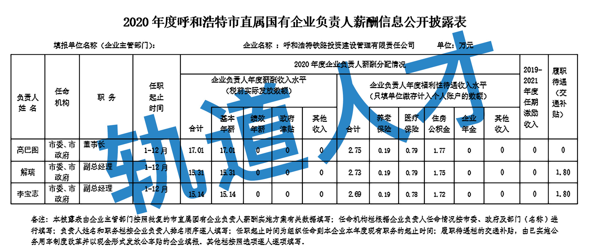 2020年度呼和浩特市直属国有企业负责人薪酬信息公开披露表(呼和浩特铁路投资建设管理有限公司)