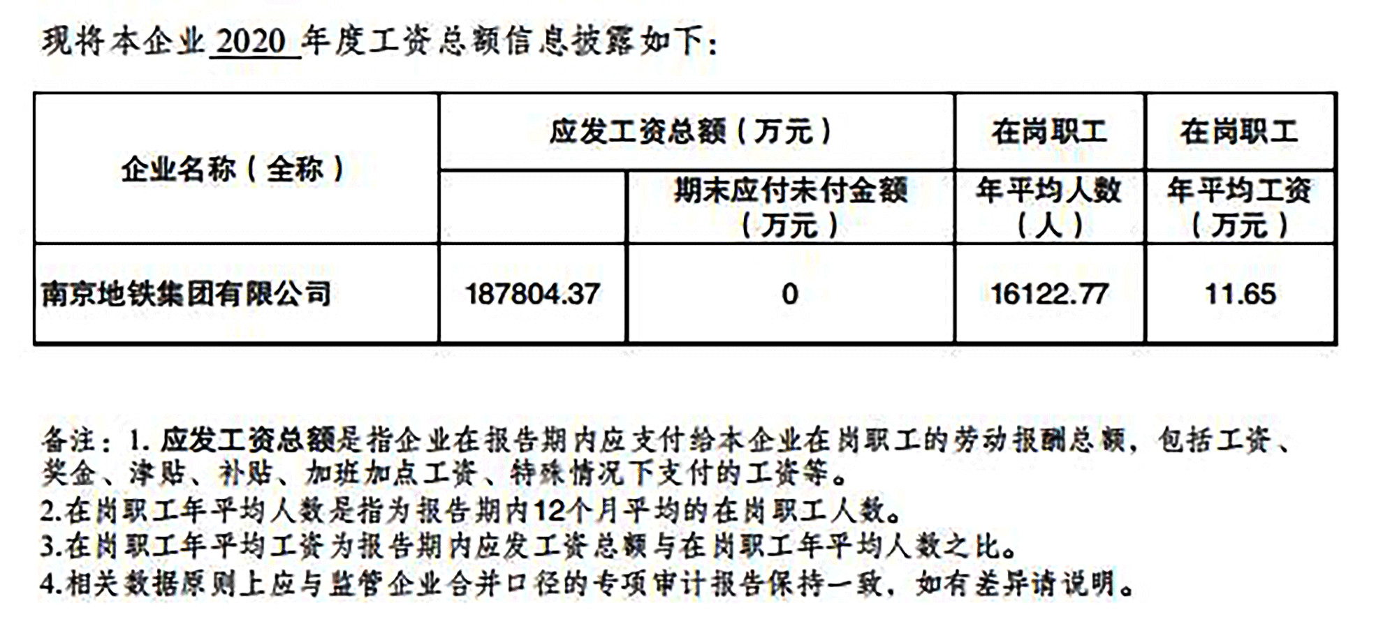 2020年南京地铁集团有限公司企业工资总额信息披露