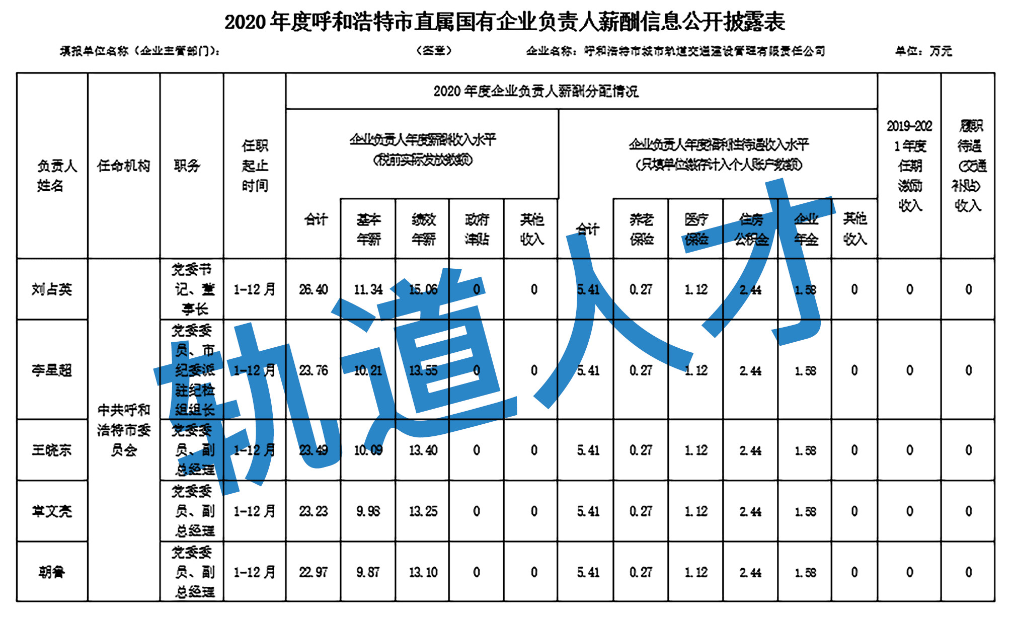 2020年度呼和浩特市直属国有企业负责人薪酬信息公开披露表(呼和浩特市城市轨道交通建设管理有限责任公司)