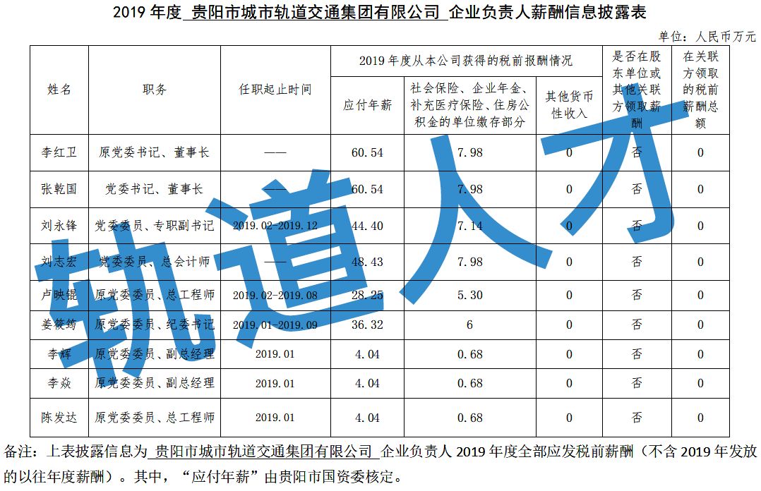 2019年度贵阳市城市轨道交通集团有限公司企业负责人薪酬信息披露表