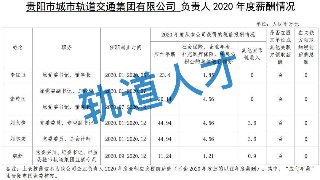 贵阳市城市轨道交通集团有限公司 负责人2020年度薪酬情况