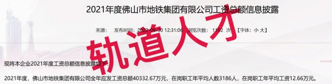 现将本企业2021年度工资总额信息披露如下: 2021年度,佛山市地铁集团有限公司全年应发工资总额40332.67万元,在岗职工年平均人数3186人,在岗职工年平均工资12.66万元。