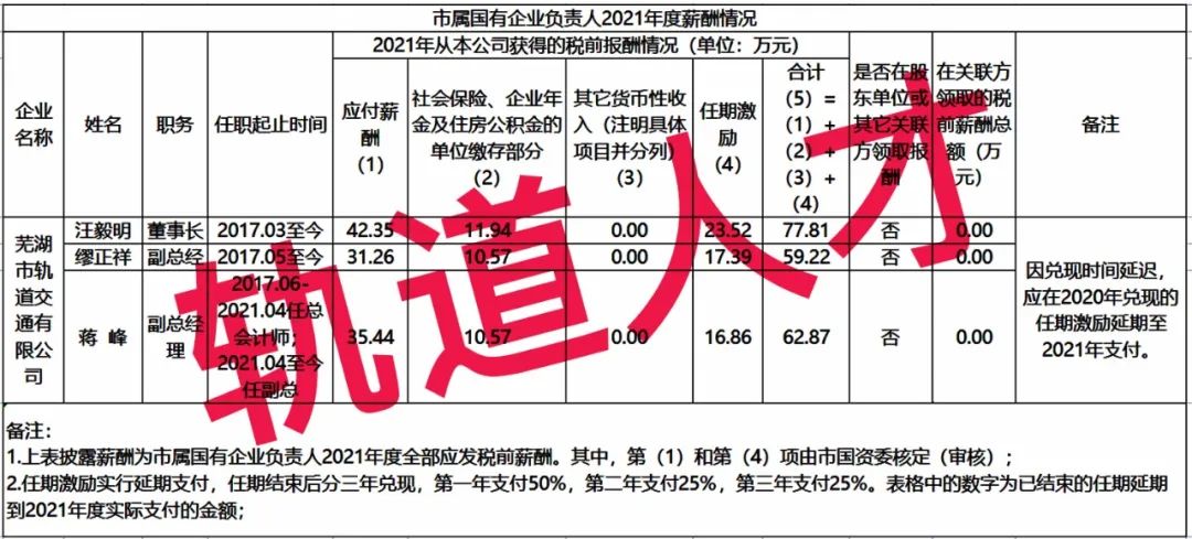 6、芜湖市轨道交通有限公司负责人2021年度薪酬情况