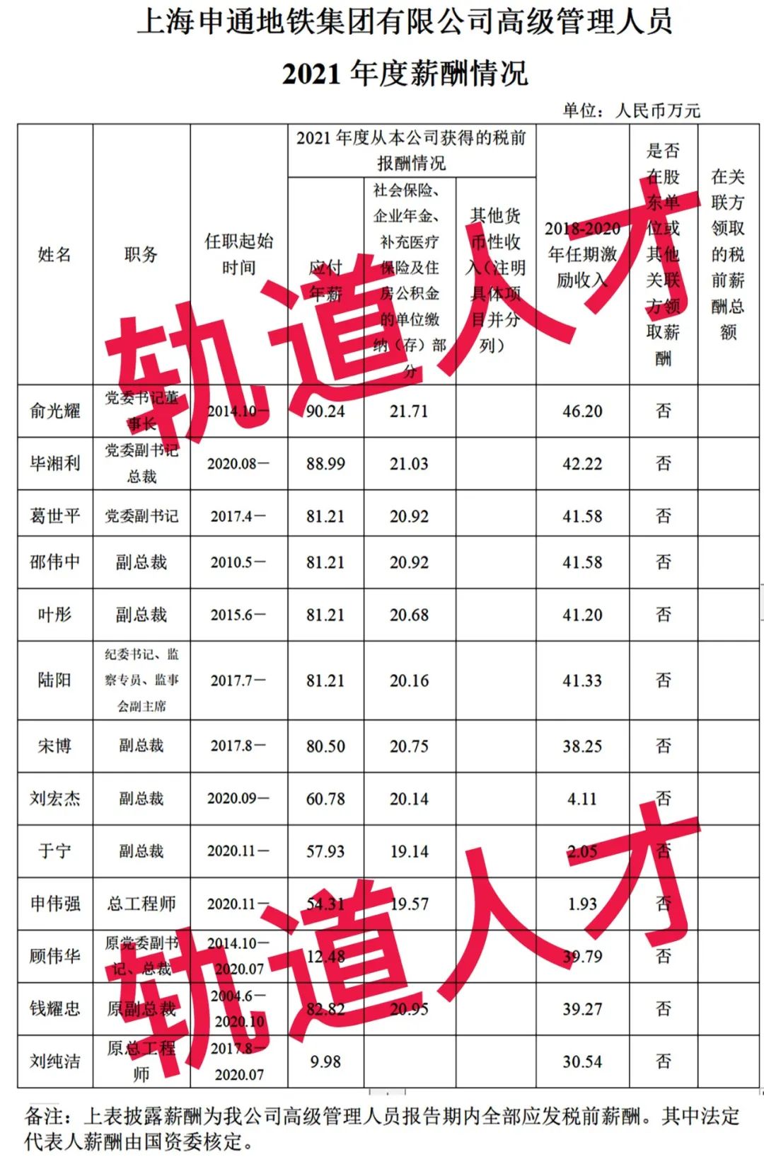上海申通地铁集团有限公司高级管理人员2021年度薪酬情况