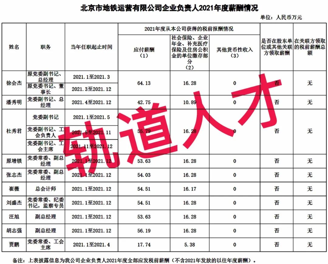 14、北京市地铁运营有限公司企业负责人2021年度薪酬信息公开