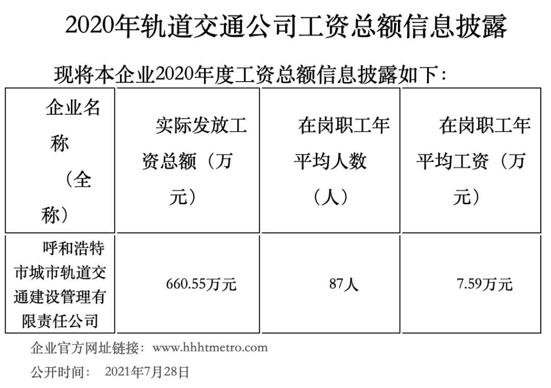 2020年呼和浩特市城市轨道交通建设管理有限责任公司工资总额信息披露