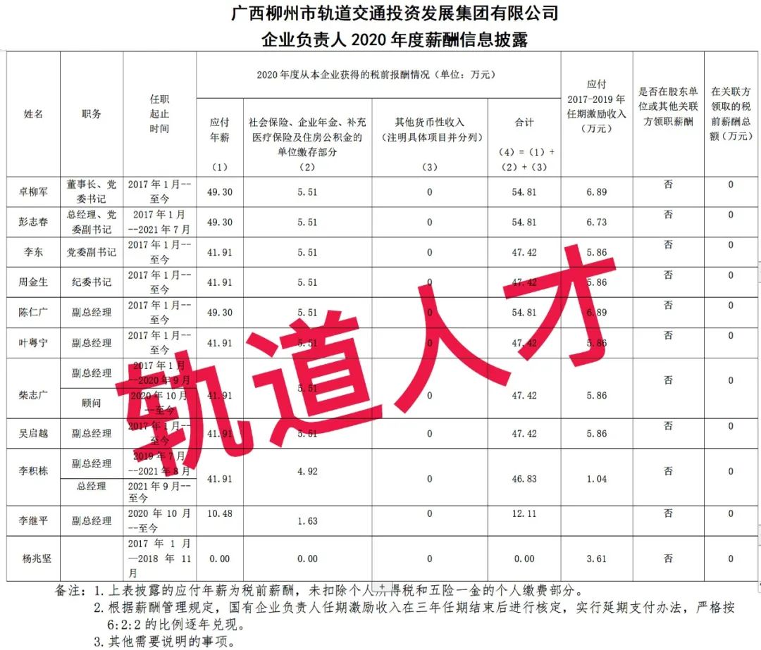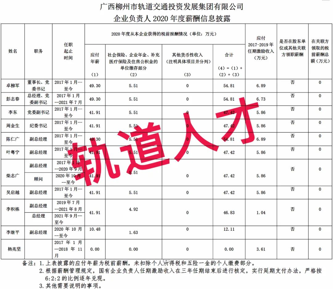 广西柳州市轨道交通投资发展集团有限公司企业负责人2020年度薪酬信息披露