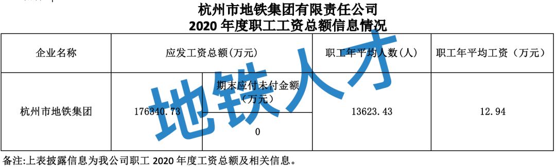 杭州市地铁集团有限责任公司2020年度职工工资总额信息情况