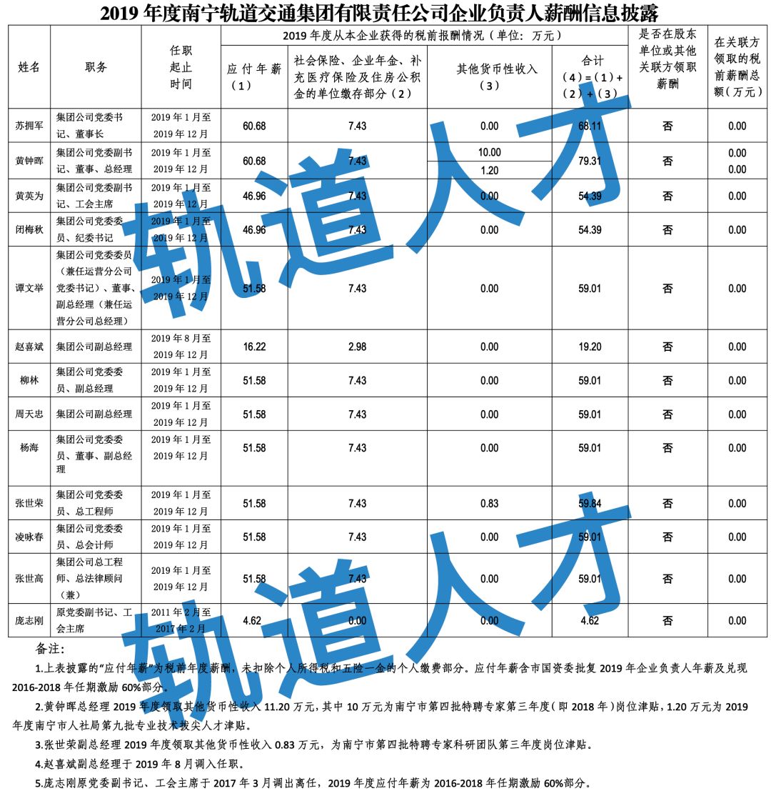 2019年度南宁轨道交通集团有限责任公司企业负责人薪酬信息披露
