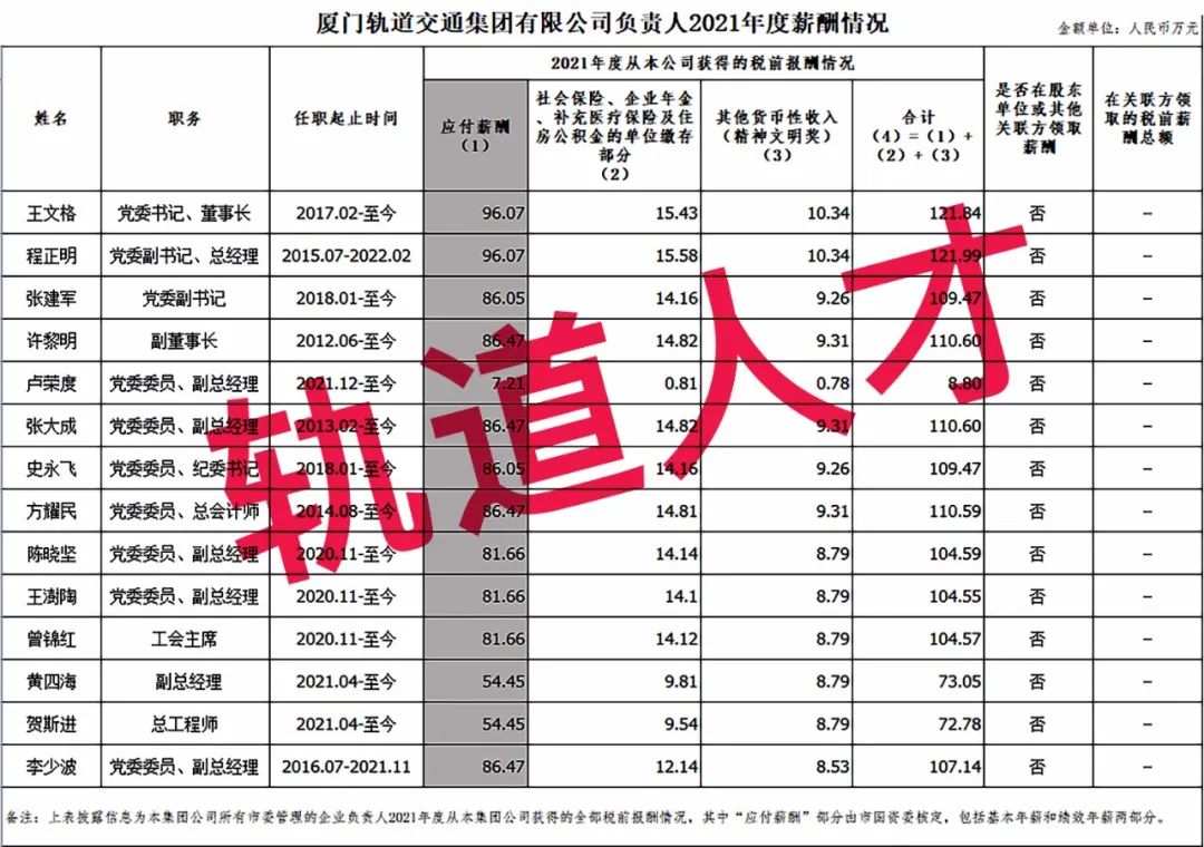 12、厦门轨道交通集团有限公司负责人2021年度薪酬情况