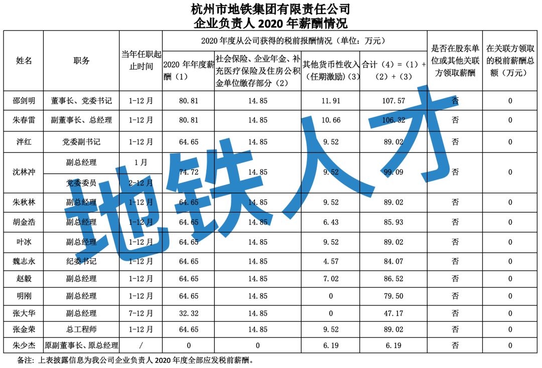 杭州市地铁集团有限责任公司企业负责人2020年薪酬情况