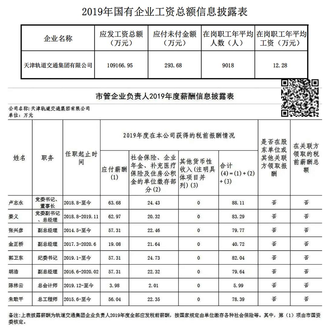 2019年度天津轨道交通集团有限公司工资总额信息披露表
