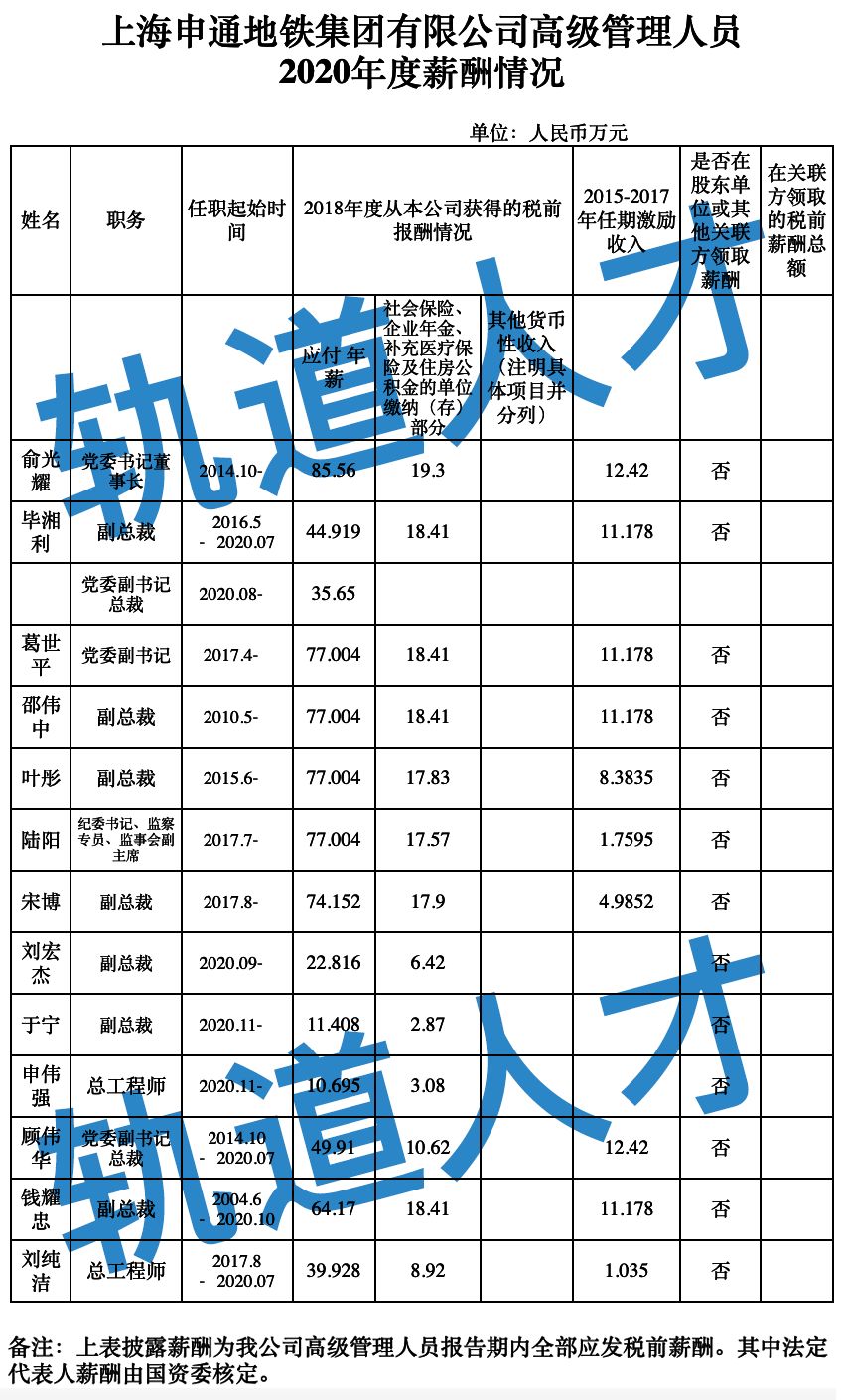 上海申通地铁集团有限公司高级管理人员2020年度薪酬情况