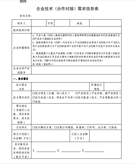 (二)征集内容。一是中小企业在新产品新技术研发、生产过程中待解决的产学研合作需求。仅限于产品技术研发创新方面的需求,不包括一般性的产品市场对接需求。二是拟与有关高校、科研院所共建产学研联合体的需求,如院士工作站、新型研发机构、工程技术研究中心、重点实验室等。