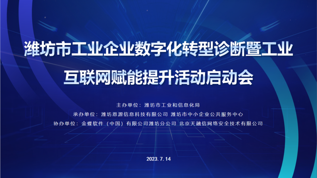 7月14日,潍坊市工业企业数字化转型诊断暨工业互联网赋能提升活动启动会成功举办。本次活动由潍坊市工业和信息化局主办,潍坊恩源信息科技有限公司、潍坊市中小企业公共服务中心承办。来自潍坊市工信局、各县市工信系统的领导、行业专家及工业企业代表们,齐聚一堂,围绕工业企业数字化转型、相关问题诊断、企业成功经验等行业内外共同关切的话题,展开深入交流与探讨,为推动工业企业成功进行数字化转型凝聚智慧、贡献力量。