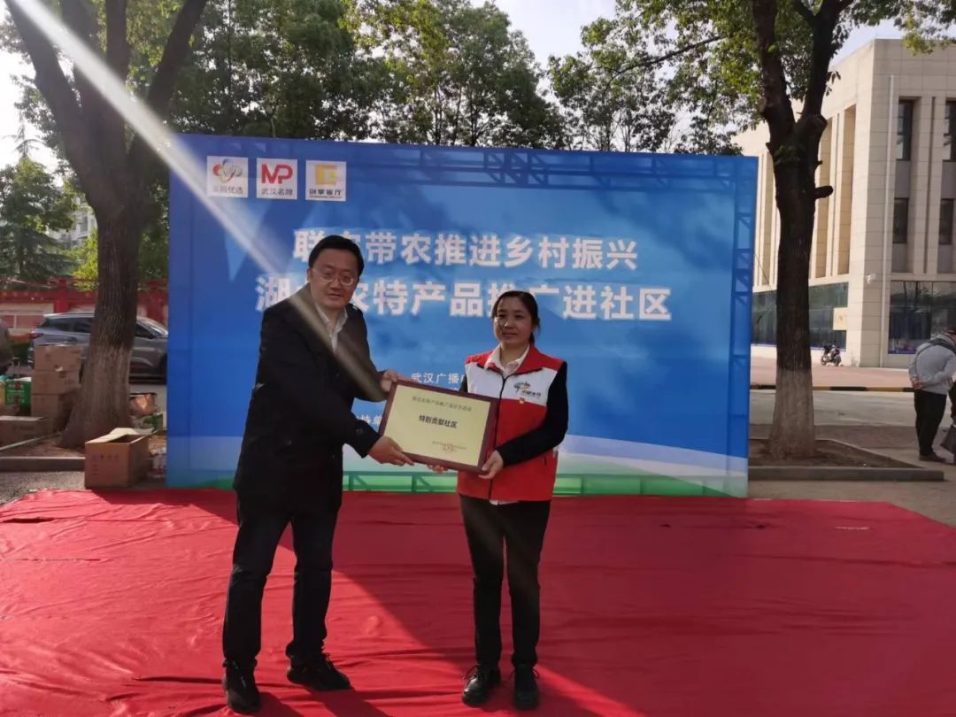 武汉电视台新娱策划总监李兵代表活动组委会,为南湖社区颁发了《湖北农特产品推广进社区活动特别贡献社区》荣誉牌匾。
