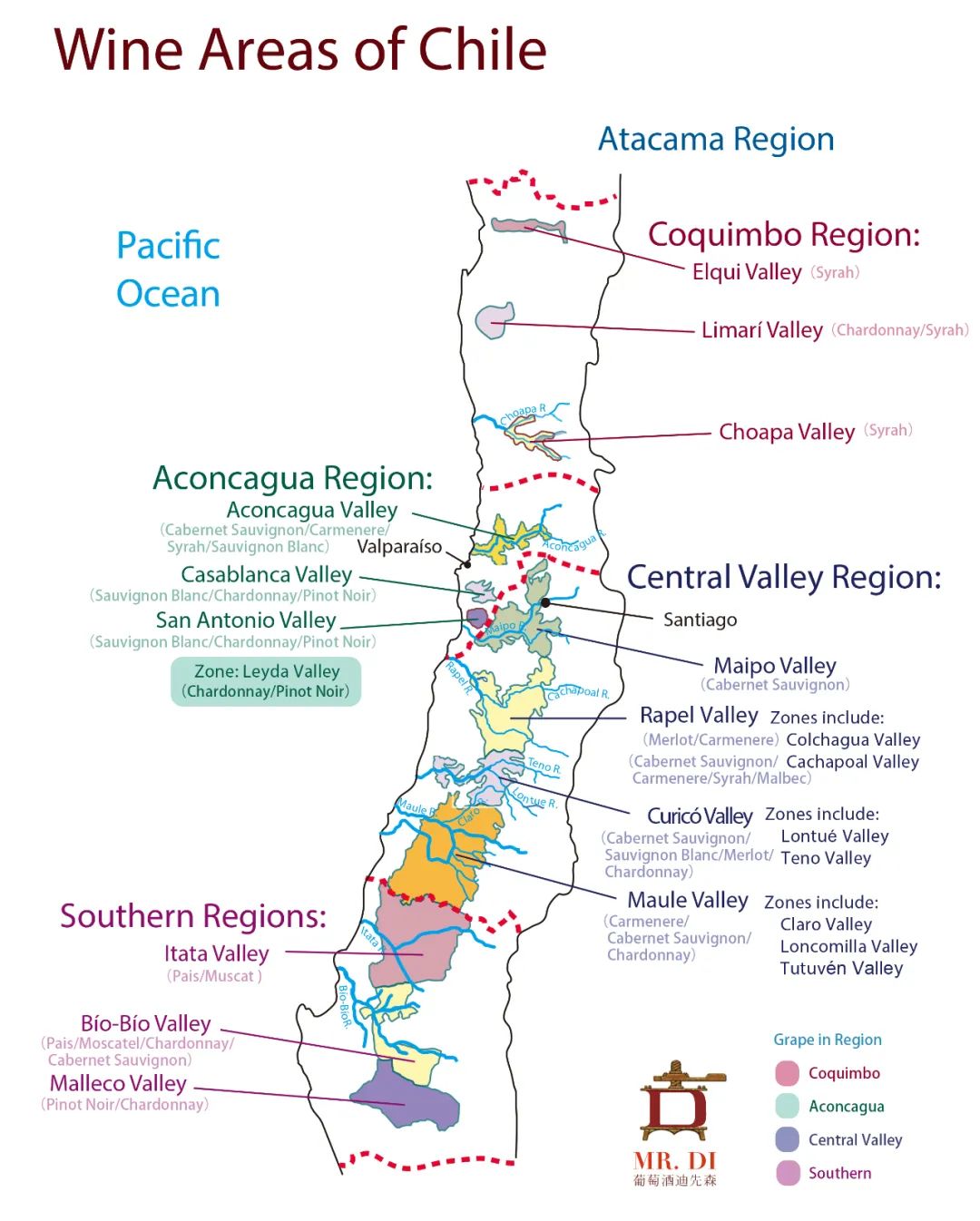 ①阿空加瓜谷:坐落在陡峭狭窄的山谷里,受益于海洋和安第斯山脉的调节作用。主要品种是赤霞珠、西拉和佳美娜。
