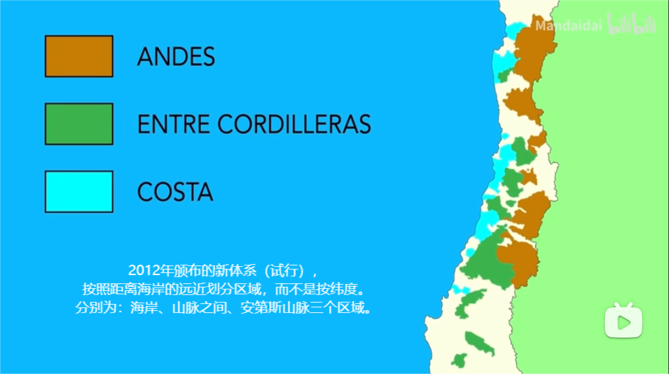 在2012年颁布的另一分级体系对葡萄酒产区做了进一步分类(属于试行方案):海岸产区、山脉之间产区、安第斯山脉产区。这些术语是在法定产区之外的酒庄可以选择使用的补充性术语。