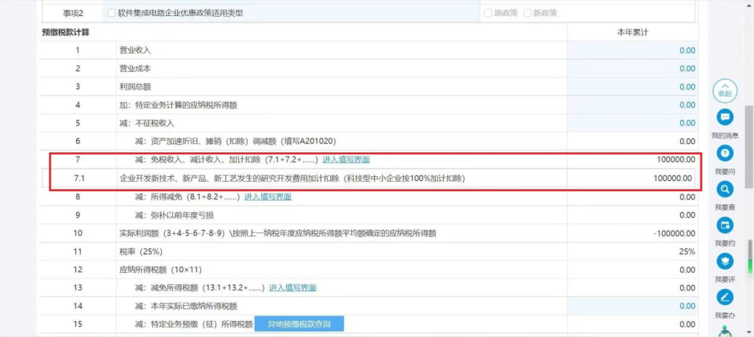 2.点击主表第7行“免税收入、减计收入、加计扣除”行次的“进入填写界面”。
