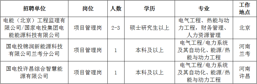 根据业务发展需要,中国电能所属企业电能(北京)工程监理有限公司、国家电投集团电能能源科技有限公司、国电投锦润新能源科技有限公司兰考分公司、国电投许昌综合智慧能源有限公司面向2023年高校应届毕业生进行公开选聘。