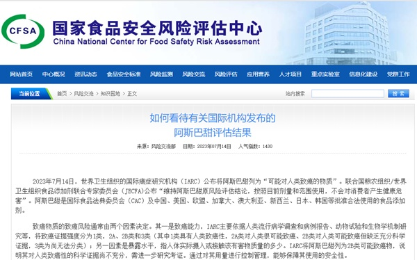 国家食品安全风险评估中心也于14日针对世卫组织两大机构的评估结果发文回应称,阿斯巴甜是国际食品法典委员会(CAC)及中国、美国、欧盟、加拿大、澳大利亚、新西兰、日本、韩国等批准合法使用的食品添加剂,国家食品安全风险评估中心联合国家癌症中心结合JECFA最新评估结果与我国居民消费情况进行安全性评估,阿斯巴甜按照我国现行标准规范使用可以保障安全。