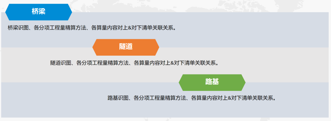 本次培训在安排上循序渐进、由浅入深,采取课堂讲解、课后练习、每日反馈、训后考核等多种形式,对公路桥梁、隧道、路基、涵洞专业的识图、工程算量进行了系统讲解,使学员逐步掌握分项工程量计算方法,知晓常见错误类型及注意事项,算量内容的对上、对下清单关联,以提升识图算量能力。