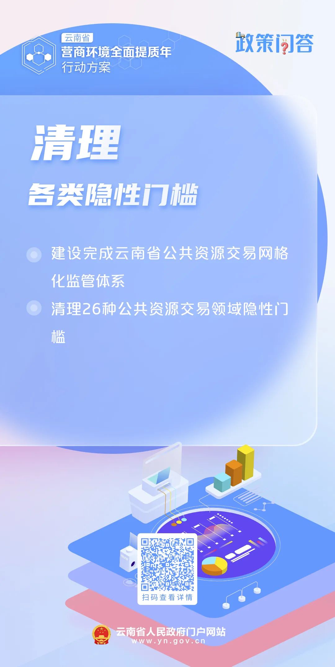 2023年,省发展改革委会同省工业和信息化厅、省财政厅、省自然资源厅、省住房城乡建设厅、省交通运输厅、省农业农村厅、省水利厅等省级部门,在全省范围内联合开展为期1年、针对违法限定投标人(供应商)所在地、注册地、所有制形式、组织形式、股权结构等26种行为的公共资源交易领域清除隐性壁垒专项整治工作,进一步清除公共资源交易过程中设置的各类不合理限制和隐性壁垒,维护公平竞争的市场秩序,进一步推动公共资源交易领域营商环境持续好转。云南省财政厅将持续开展政府采购营商环境跟踪指导,重点清理云南省政府采购领域存在的各类隐性壁垒和不合理的门槛限制,并在云南省政府采购网公布“政府采购领域营商环境不良行为清单”。企业作为供应商在参加政府采购活动中发现隐性门槛、不合理限制时,可以按照《政府采购质疑和投诉办法》(财政部令第94号)规定,向采购人、采购代理机构提出质疑,若对采购人、采购代理机构的答复不满意,可依法向同级财政部门提起投诉。