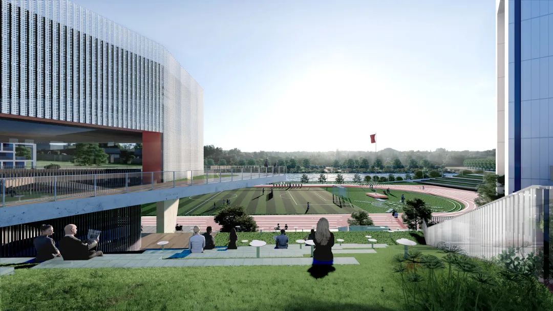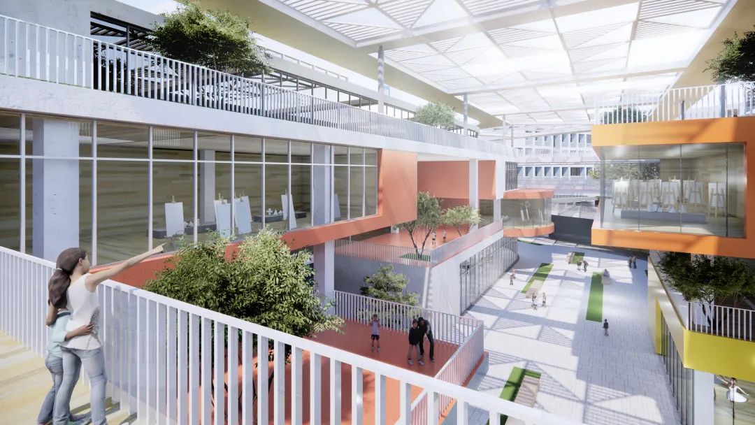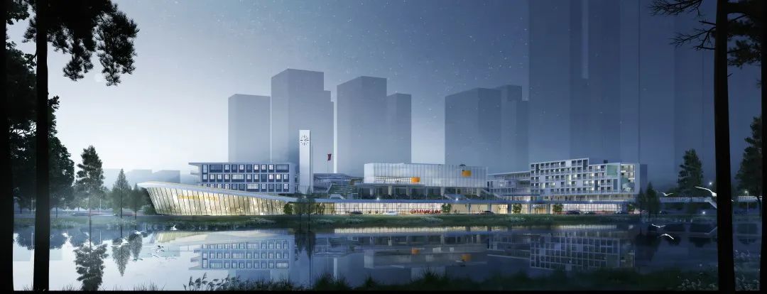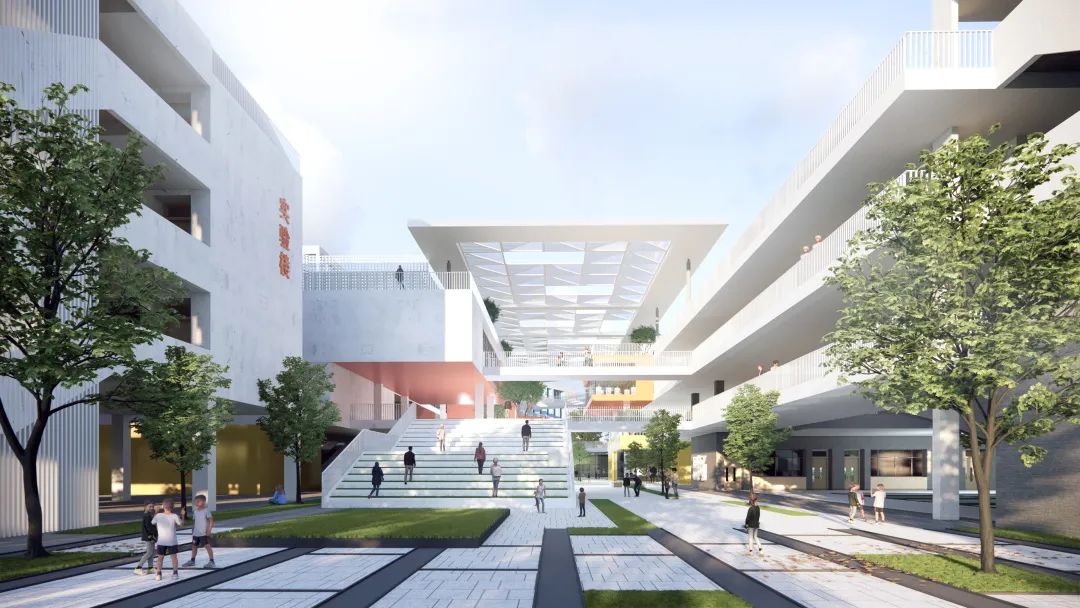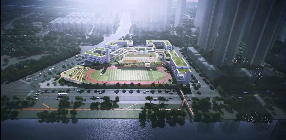 申都设计集团有限公司+洲宇设计集团股份有限公司联合体设计的沙井街道会展中心九年一贯制学校新建工程中标,项目以“文体乐园”为设计理念,意在为师生们打造一个更自然生态的校园。建设单位为深圳融华置地投资有限公司。用图说明:本文建筑主体效果图引用了网络上申都设计集团有限公司/洲宇设计集团股份有限公司联合设计的方案,不代表为最终方案及呈现效果,如涉及版权问题,请联系作者。 学校位于深圳市宝安区沙井街道沙福路西延段与展景路交汇处西北侧,东临白鹭河滨河景观带,西接城市公园绿地,具备丰富的景观资源。该项目为一所新建九年一贯制学校,规划用地面积为34860平方米,总建筑面积84000平方米,绿地率为30%,容积率为1.78,建筑层数5层。 项目建成后,学校办学规模为开设72个教学班,其中小学部设置54个班,初中部设置27个班。除此之外,该项目还将设置机动教室9个班,提供420个学位。学校总共可以为周边地区提供3780个学位。 统领校园规划的文、体、音、美资源中心会展中心学校在云海臻府旁,此外,项目500米处还规划了一所56个班的九年一贯制学校,可谓是好校成双。可以满足片区的教育需求了