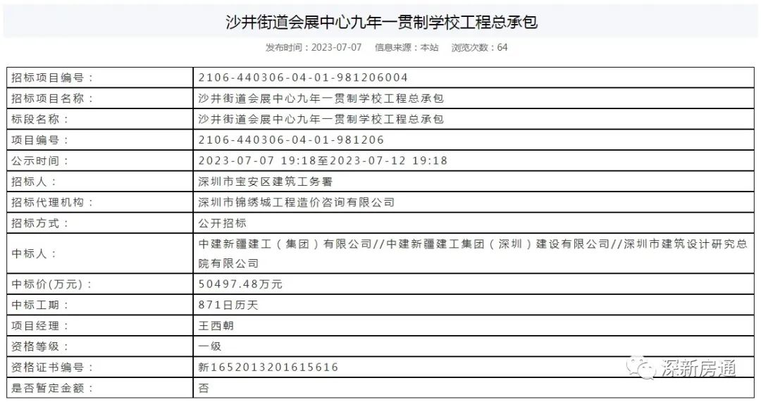 会展中心学校已动工啦!!72个班小学到初中9年一贯制学校 2023年7月7日,深圳市宝安区沙井会展中心九年一贯制学校(暂定名)工程总承包正式定标,中标结果已在深圳公共资源交易公共服务平台发布公示,该项目将正式进入施工建设的流程节点,预计25年完工。 为会展片区处于前海扩容板块的教育资源填补空白,基本上是以最高级别做规划的,集团化办学的大政策条件下,会展海洋城板块的生源方面也是非常优质的,大概率可能会出现名校,届时片区内的教育资源将迎来腾飞蜕变。沙井街道,目前的规划能级很高:不仅属于前海扩容区域,还处在国际会展城、海洋新城、海上田园城三城规划核心板块。