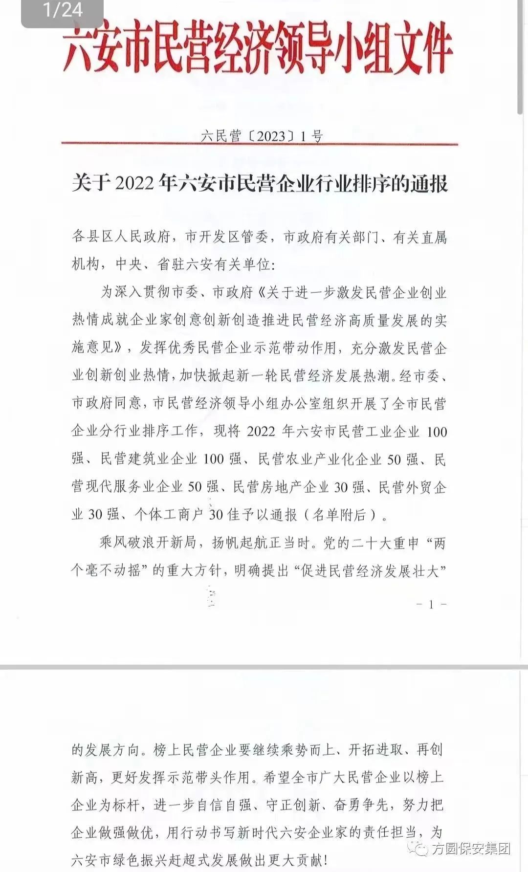 在安徽方圆保安服务集团有限公司荣获2022年六安市民营现代服务业企业50强殊荣之际,衷心感谢广大客户和合作伙伴对公司的信任和支持!感谢全体员工的辛勤付出和无私奉献!