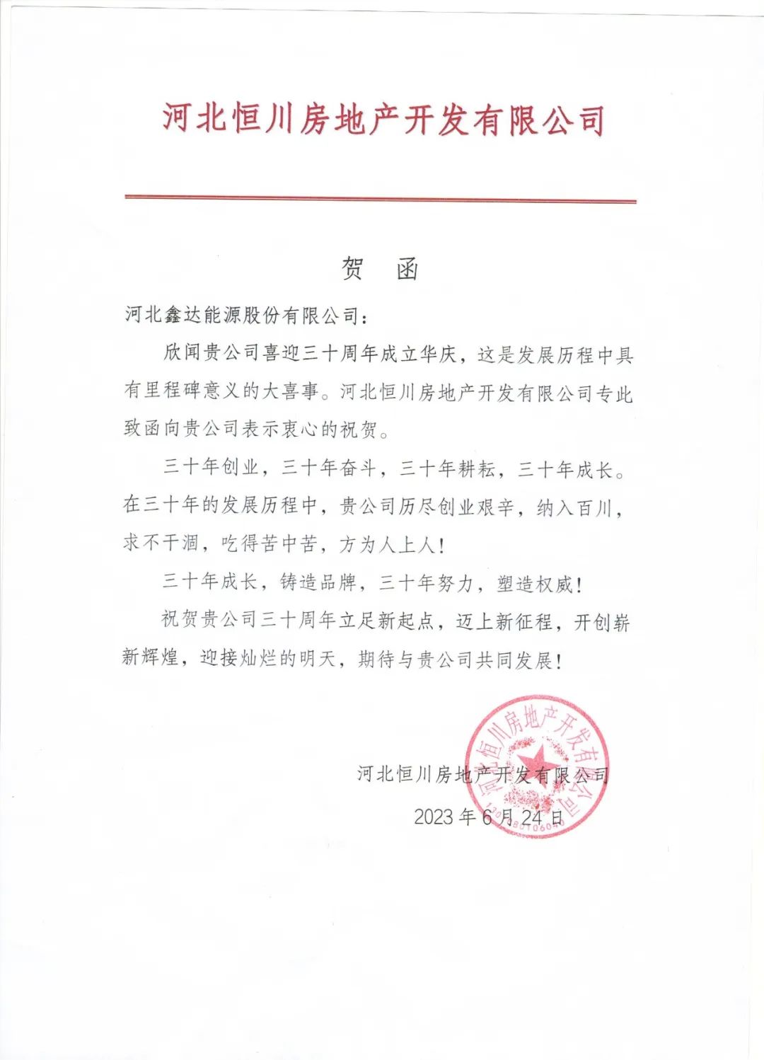 第35封贺信!河北恒川房地产开发有限公司祝鑫达公司成立30周年!