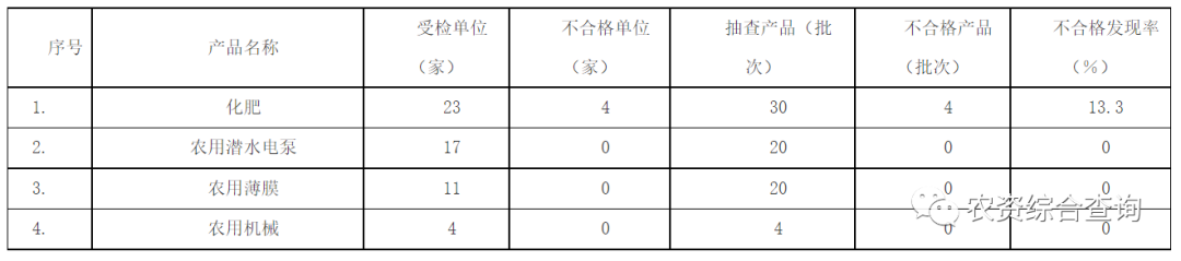 本次抽查化肥、农用潜水电泵、农用薄膜和农用机械4种产品74批次。其中抽查生产企业27家35批次,抽查经销单位28家39批次。经检验,生产企业未发现不合格,经销单位4家4批次产品不合格,不合格发现率为5.4%。具体如下: