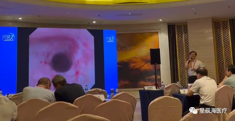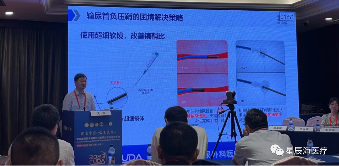 会议期间,解放军三〇一泌尿外科沈诞教授介绍了星辰海的7.5Fr一次性电子输尿管镜,超细镜体改善镜鞘比,配合负压鞘,回水量更好,更能有效控制肾内压。