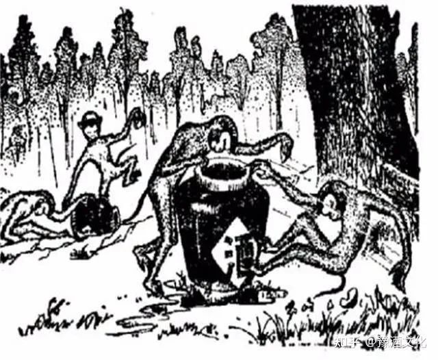 关于猿猴造酒有这样一个传说,猿猴在水果成熟的季节,收贮大量水果于“石洼中”,堆积的水果受自然界中酵母菌的作用而发酵,石洼中就会有类似“果酒“的液体析出,这就成为猿猴造出的“猿酒”。后来猿猴造酒逐渐被人类发现并完善,最终形成现代意义上的酒。