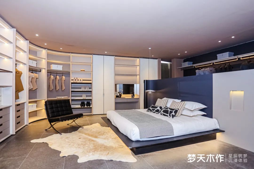 卧室空间柜体采用桃花芯木与皮革均有着温润的表面,细腻的触感,带给卧室空间满满的安全感。圆弧转角柜设计,区别于传统L形折角形状的转角柜,圆弧转角可以给空间更多的包围感,精准的加工造就梦天木作圆弧转角柜的拼接,完美落地。强大的壁挂系统,将多元的模块组件组合,功能分区,随心所欲,自在而行。