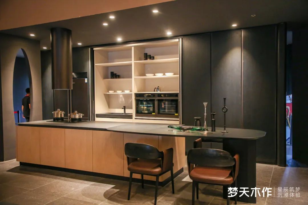 值得一提的是,客餐厨一体化空间作为此次展厅“门面担当”,巧妙运用单元模块设计,造型无穷变幻。超高柜设计,V型圆弧造型,细腻圆角,精致收口,立板形成金属与木饰面的混搭碰撞,温润又个性,有效提升空间的层次感和视觉效果。橱柜运用口袋隐藏折叠回旋门,使用之物一应俱全,超大收纳。