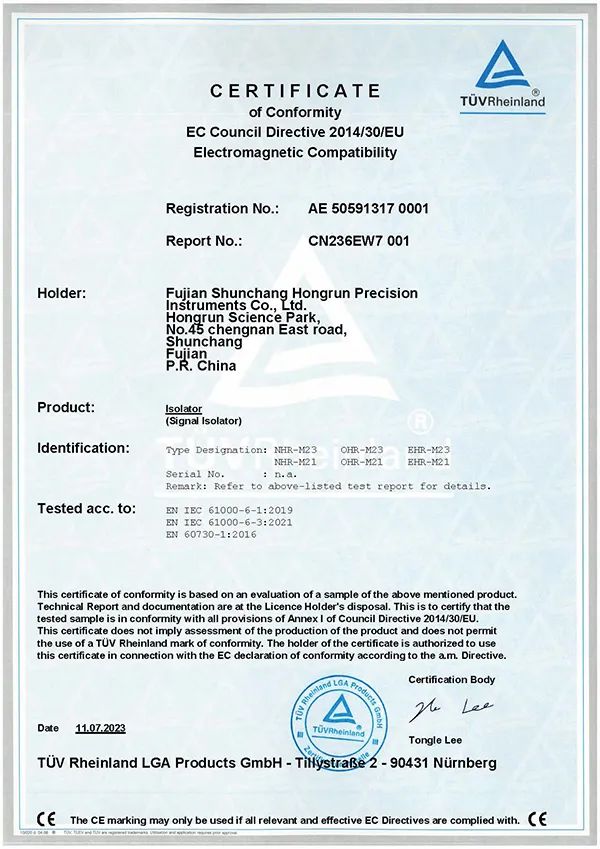 M21/M23系列信号隔离器/配电器TÜV莱茵CE证书