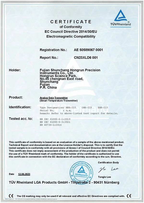 近日,虹润公司M22系列温度变送器、M21/M23系列信号隔离器/配电器、215系列HART温度变送器、213系列智能温度变送器等产品通过了德国TÜV莱茵国际权威认证。