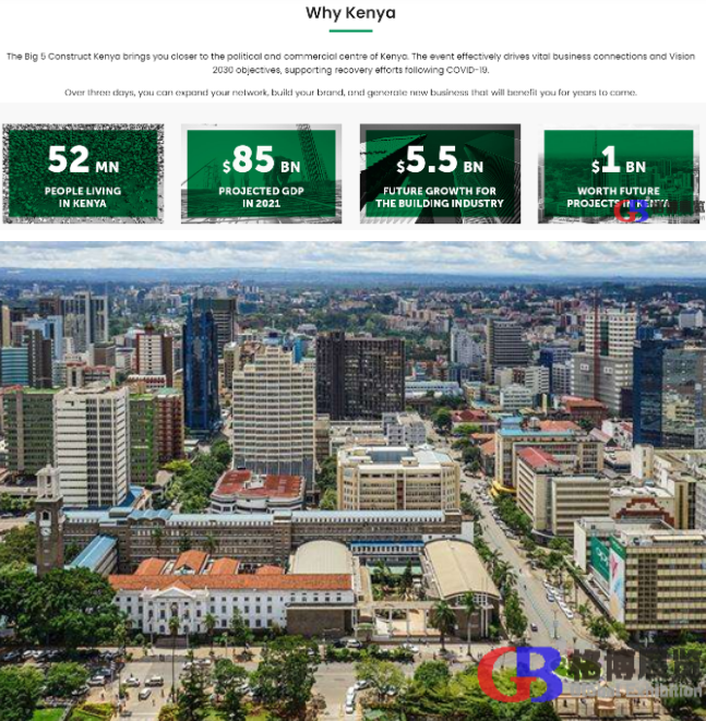 肯尼亚内罗毕五大行业展览会(Big 5 Construct Kenya)是全球三大建材展big5系列展之一。自2016年首届举办以来,每年一届。展会是由主办方DMG EVENTS展览公司主办, 公司总部位于阿联酋迪拜,自1989年开始在沙特阿拉伯,新加坡,加拿大,南非和英国开展业务,是一家国际性的展览和出版公司。每年吸引超过350,000名参观者参加80个展览。