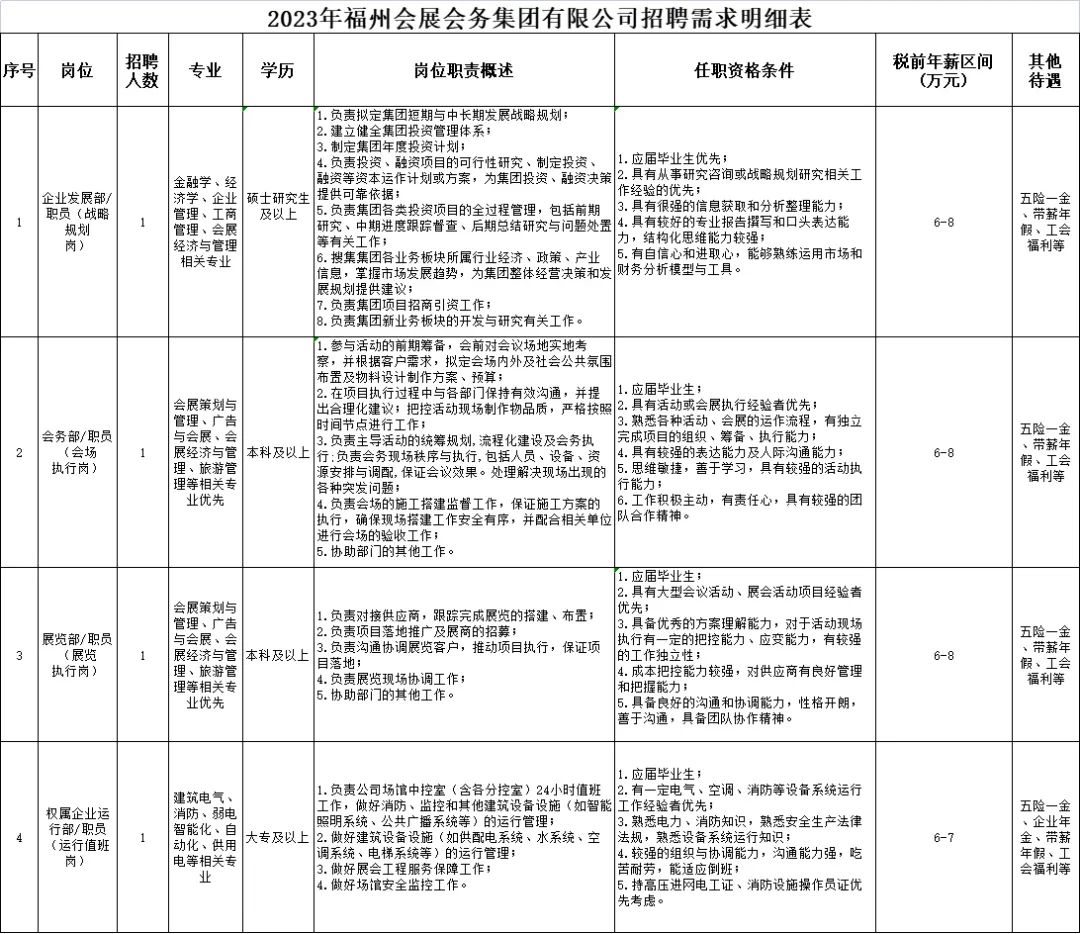 福州会展会务集团有限公司组建于2022年1月,是福州市属国企福州古厝集团有限公司的全资子公司,注册资本5000万元,员工约200人,主营业务涵盖会展场馆运营管理、会展活动主办承办、会展服务保障及延伸服务“三大赛道”,规划向国际化、专业化、市场化发展,致力打造区域会展业龙头企业。现因业务发展需要,公开招聘4名工作人员,现将有关事项公告如下: